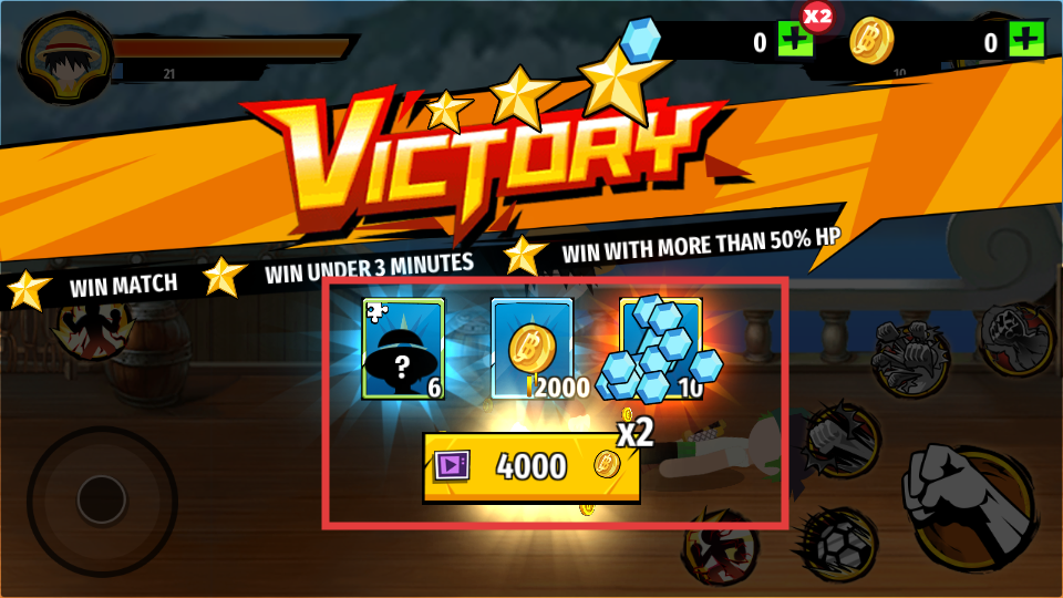 4、胜利后领取【?】-6、【Coin】-2000、【Crystal】-10奖励,可看广告翻倍金币至【4000】。