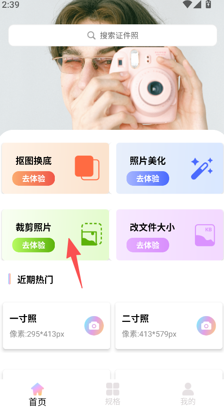 2、功能分类清晰明确,含抠图换底照片美化等独立模块,近期热门板块前置展示常用证件照规格,便于快速定位所需功能。