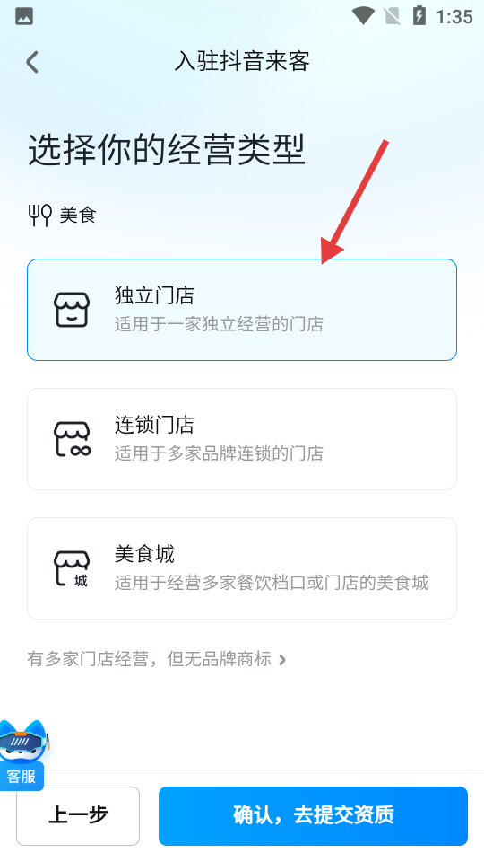 2、选择经营类型,以【独立门店】为例,点击【确认,去提交资质】。