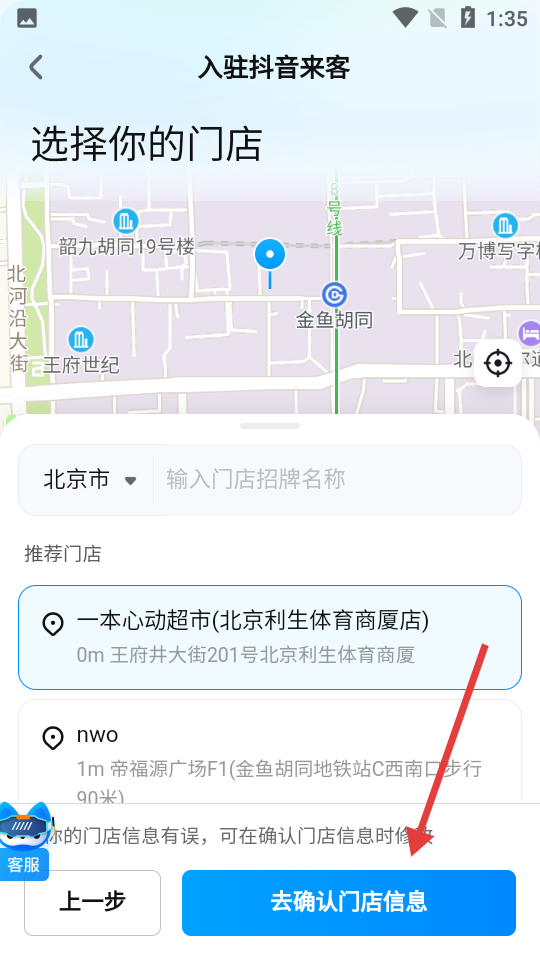 3、选择门店,输入门店招牌名称后,点击【去确认门店信息】。