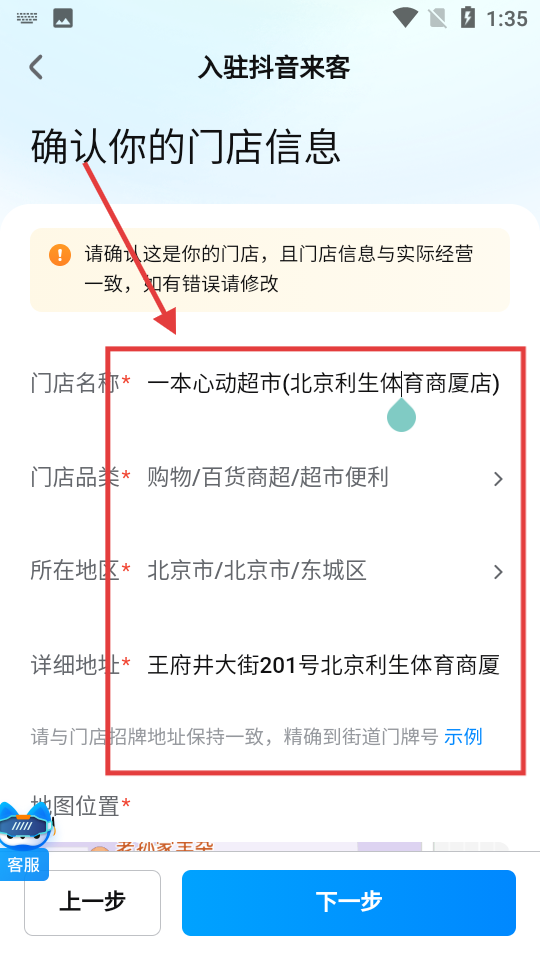 4、确认门店名称、品类、所在地区、详细地址等信息,确保准确后进行下一步操作。