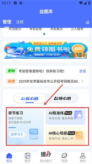 1、在益题库的“提分”页面,选择要刷题的模块,以章节练习为例。