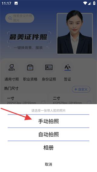 2、在选项中点击【手动拍照】,进入证件照拍摄的界面。
