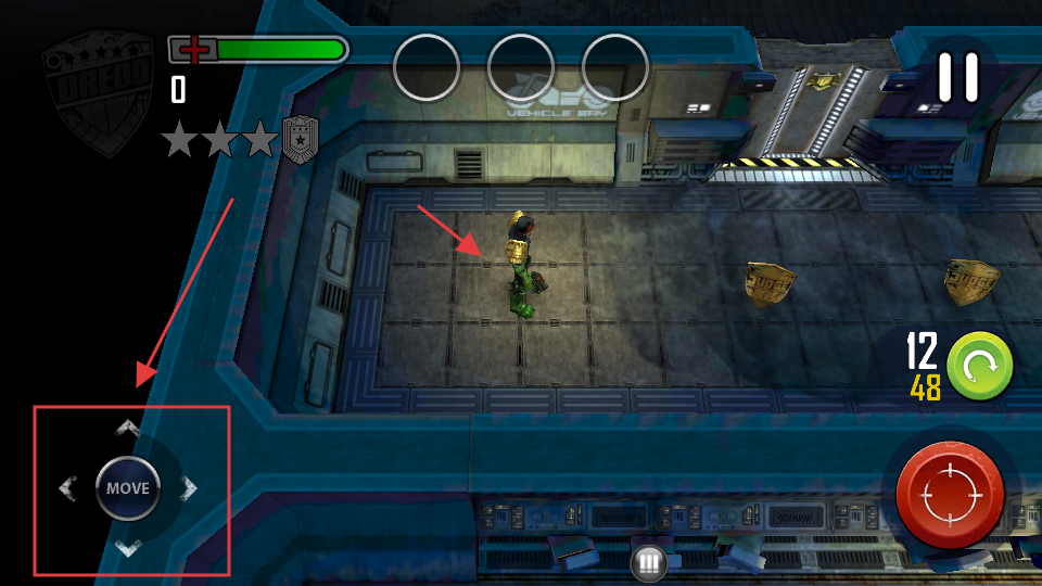 2、用左侧【MOVE】按钮操控角色在网格场景移动,前往箭头指示位置,准备收集【JUSTICE-SHIELD】。
