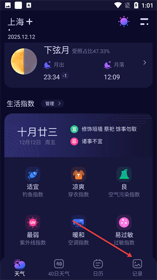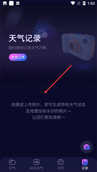 1、点击底部【记录】按钮,进入天气记录页面。