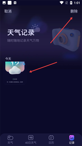 3、选中目标天气记录,点击右上角【删除】按钮。