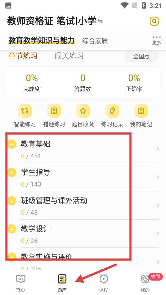 1、点击底部【题库】,进入题库页面,选择对应的科目章节。