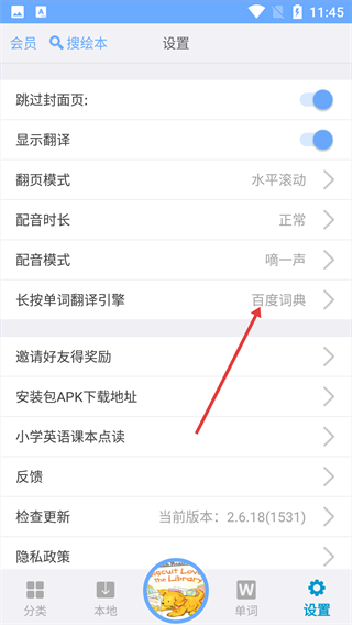 2、进入设置页面后,点击【长按单词翻译引擎】选项。