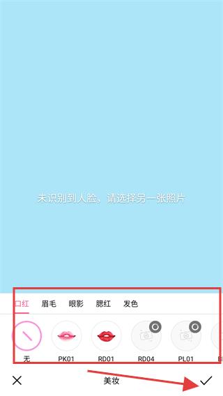 4、选择美妆功能(如口红)后,确认效果,点击对勾按钮完成美化并保存。