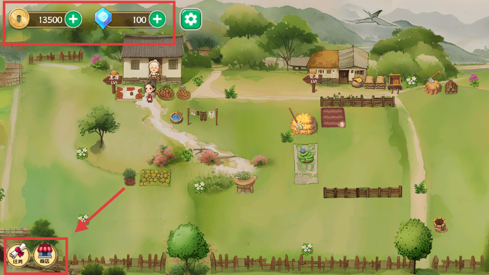 1、点击左下角【任务】可查看待完成事项,【商店】能购买道具,顶部【金币】【钻石】是主要货币,可通过任务或充值获得。