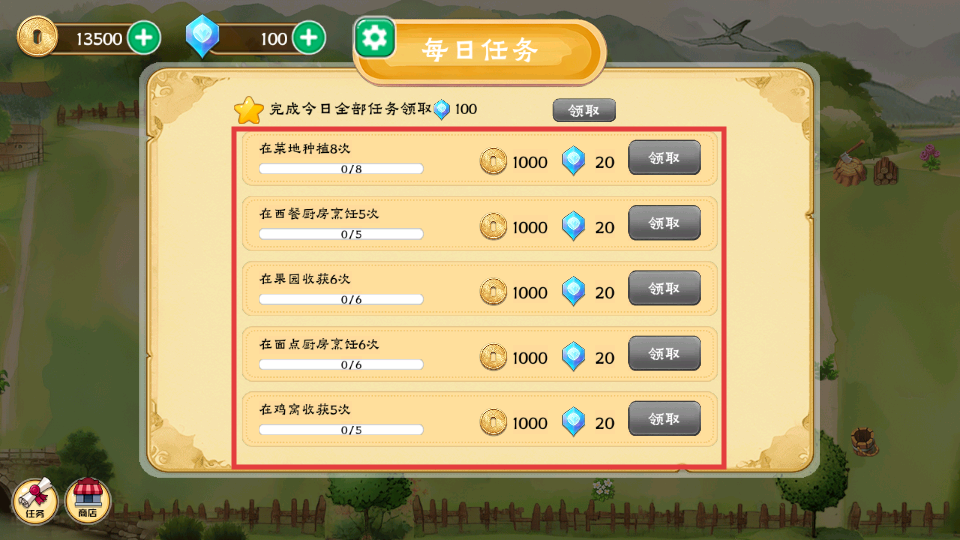 2、每日任务包含在菜地种植8次、西餐厅帮忙5次等,完成单个任务可领【1000金币】【20钻石】,全部完成额外得【100钻石】。