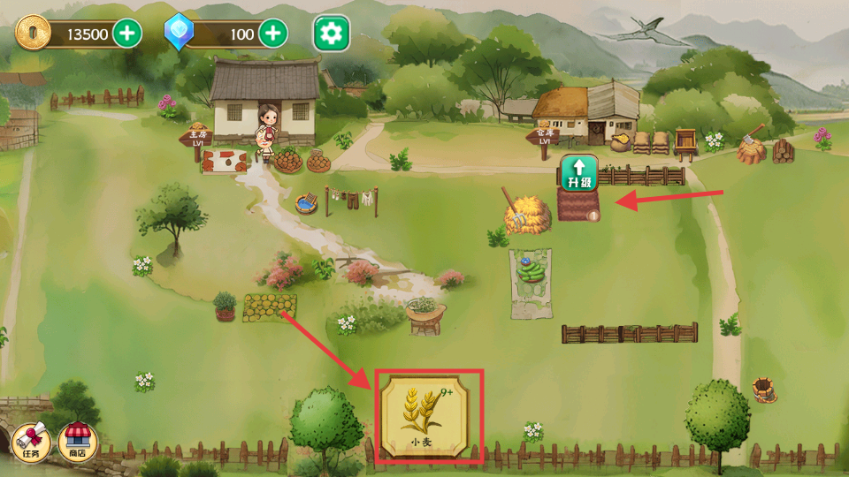 3、点击【小麦】图标可种植作物,右侧带有【升级】标识的建筑可提升等级,解锁更多功能。
