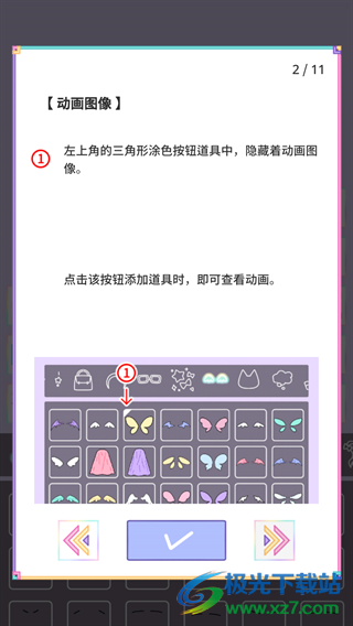 左上角的三角形涂色按钮道具中,隐藏着动画图像,点击该按钮添加道具时,即可查看动画。