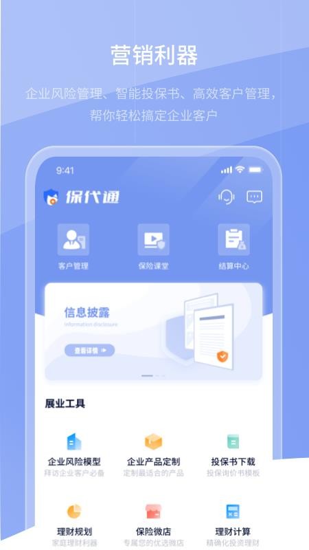 保代通app是一款由五洲(北京)保险经纪有限公司打造的专为为保险人员提供企业保险业务拓展的工具,这款软件是广大保险人员拓展销售业务的最佳选择,这里有丰富的功能,你可以在线对客户进行管理,随时跟踪客户动态,发现潜在的客户,还有提供丰富的保险课堂,各种精品课程随时看,提高自己的销售技能;另外,在保代通软件上还有提供丰富的展业工具,涵盖了企业风险模型以及企业产品定制和投保书下载等等服务,为你的工作提供辅助作用,提高办事的效率,是你营销的小帮手,这里还有更多的功能等你解锁,如果你需要的话那就下载吧。