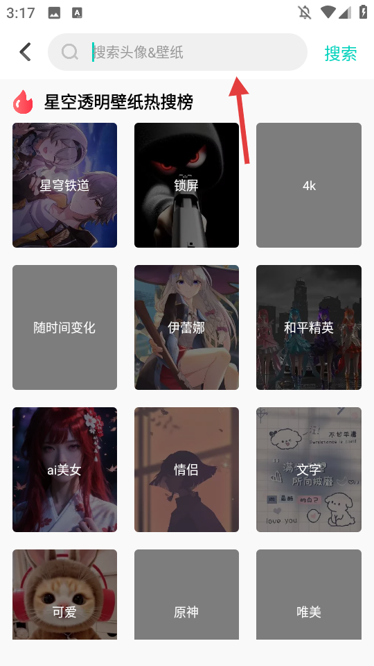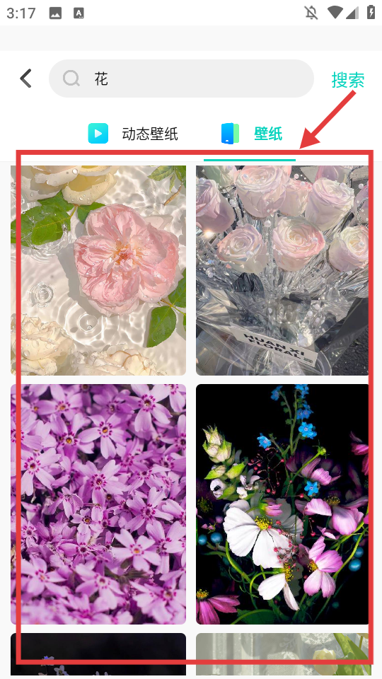 2、在搜索页面输入关键词(如“花”),查看壁纸搜索结果。