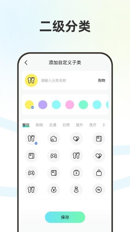 支持用户对消费的自定义进行划分,可以自由的设置二级分类