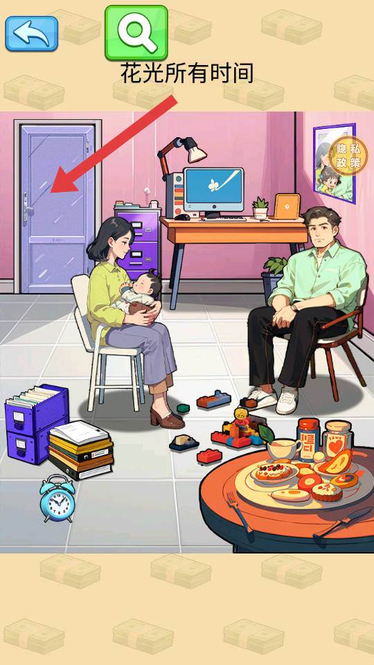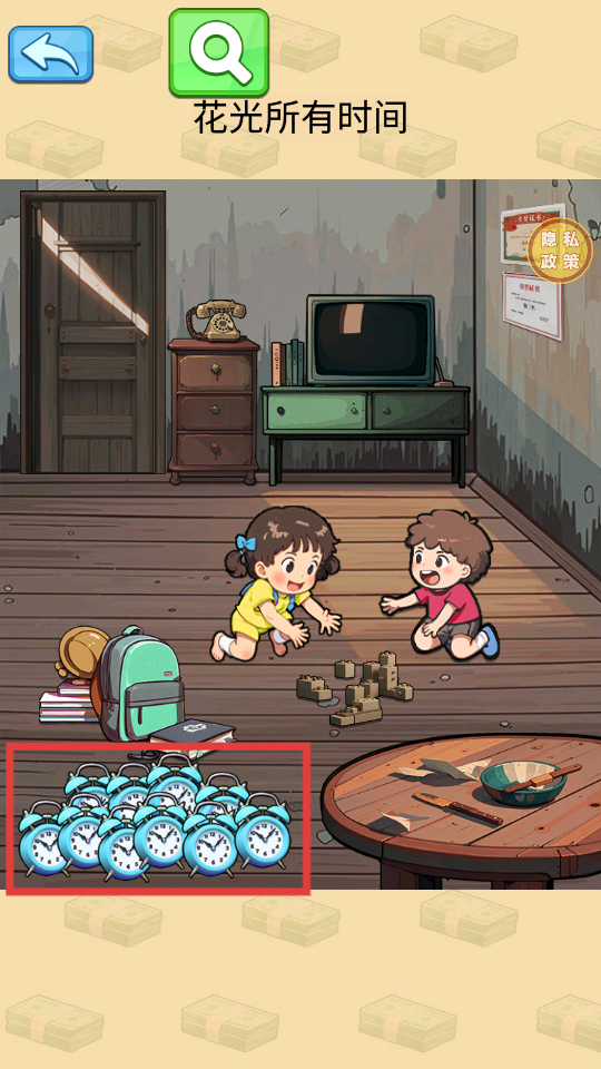 1、进入“花光所有时间”关卡,将红框内的【蓝色闹钟】拖到人物、场景中推进游戏。