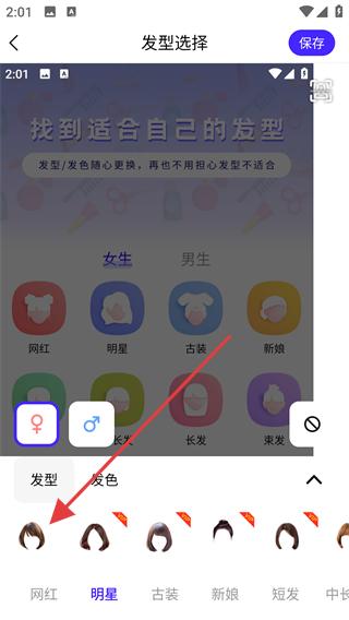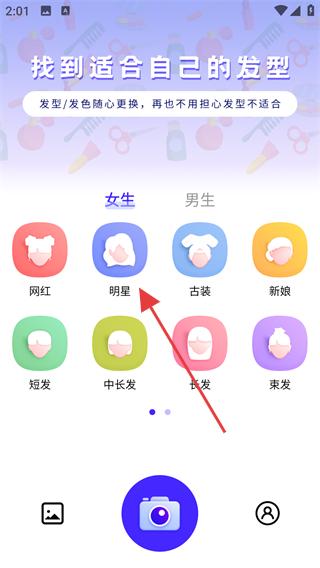 1、在主界面选择【女生】或【男生】分类,点击对应发型风格(如网红、明星),准备匹配发型。