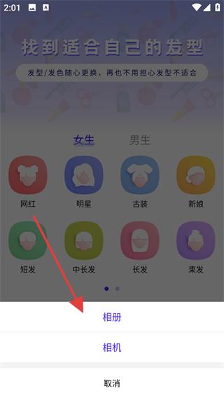 2、点击底部按钮选择【相册】。从手机相册中选取要编辑的照片,导入软件进行发型匹配。