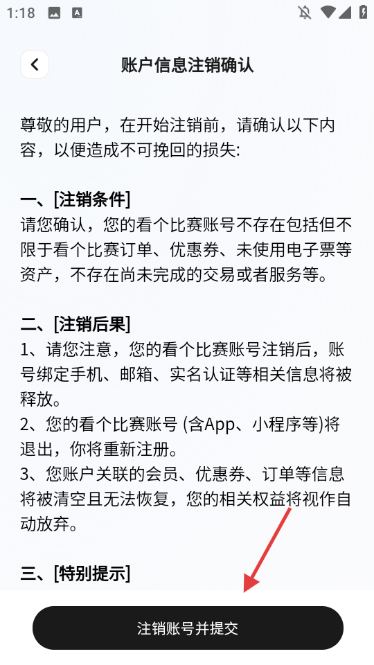 4、确认注销条件、后果及特别提示后,点击【注销账号并提交】,完成账号注销操作。