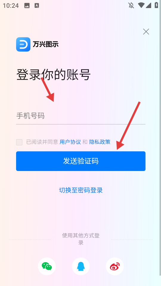 2、在登录界面输入手机号码,点击“发送验证码”。