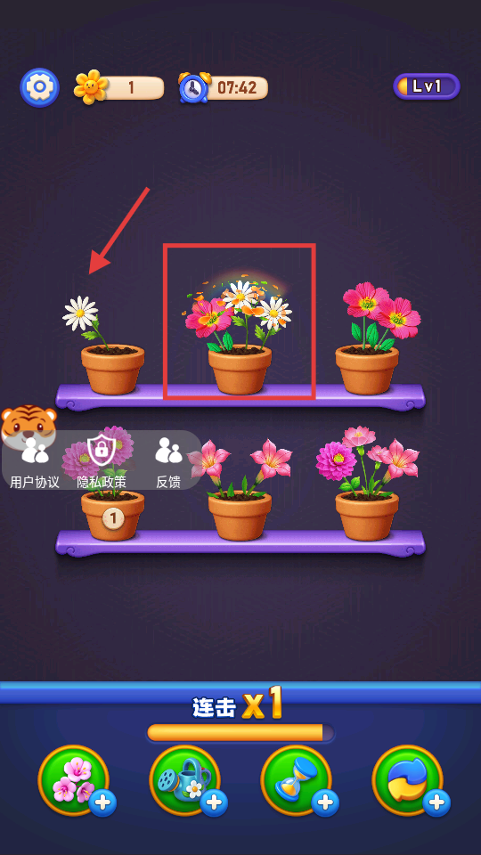 2、将左侧的【雏菊】拖动到中间花盆,与同系花灵共鸣触发消除效果。