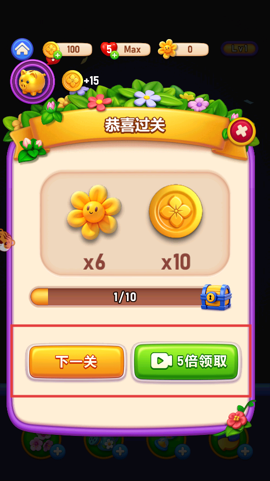 4、过关后点击【下一关】继续挑战,或选择【5倍领取】看视频获得额外奖励。