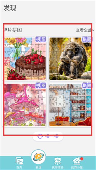 2、进入发现页面后,选喜欢的拼图素材,点对应的【拼图】按钮,就能开启该素材的拼图关卡哦。