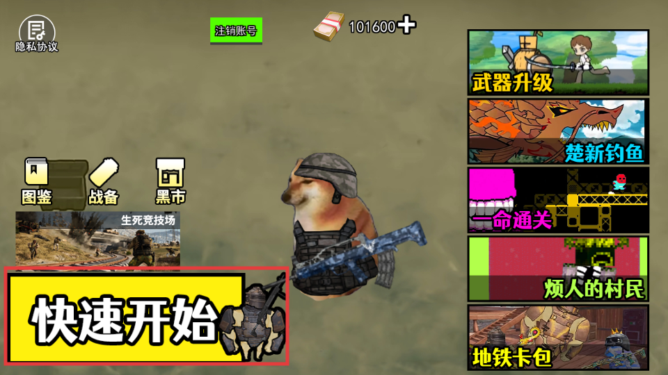 1、主界面点击【快速开始】可直接进入游戏,界面还有【图鉴】【战备】【黑市】等功能入口,右上角显示当前拥有的【101600+】金币,可用于后续升级或购买道具。