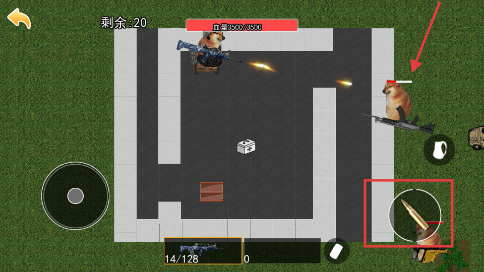 2、战斗时右下角的【子弹】图标是换弹键,当武器弹药不足时点击可补充子弹,左侧移动摇杆控制角色移动,上方显示剩余敌人数量【20】和当前血量【3500/3500】,注意及时躲避敌人攻击。