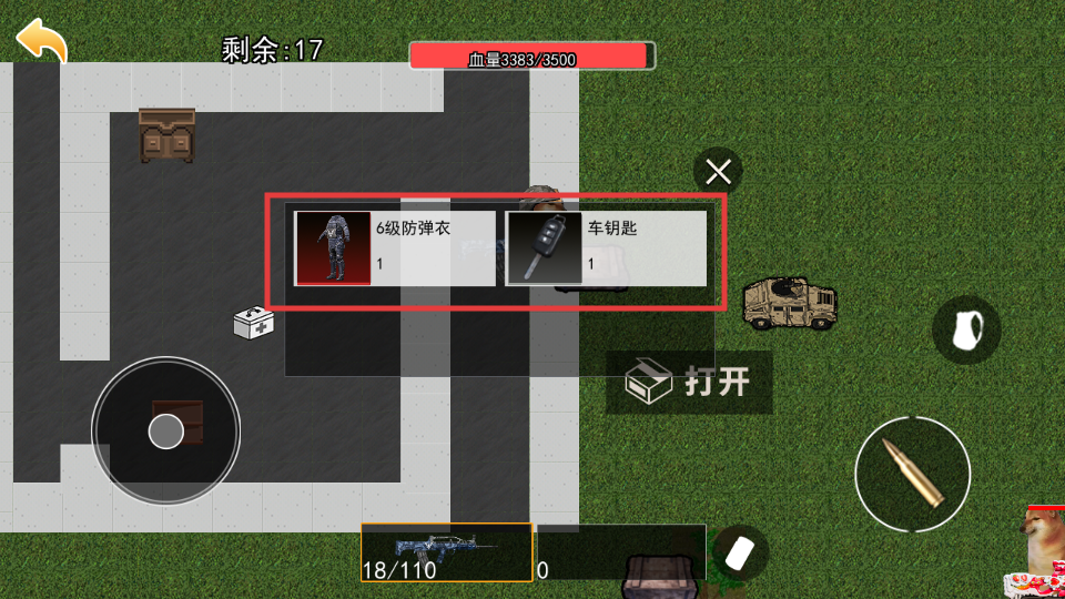3、战斗中遇到带有【打开】标识的箱子时,点击可开启,能获得弹药或道具补充,此时剩余敌人【17】,血量【3383/3500】,弹药耗尽时更要注意寻找箱子获取补给。