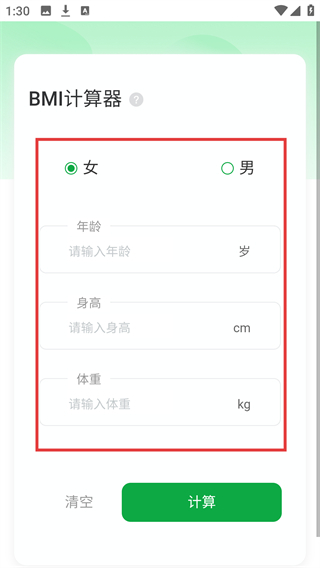 3、在BMI计算器中选择性别,填写【年龄】【身高】【体重】等信息。