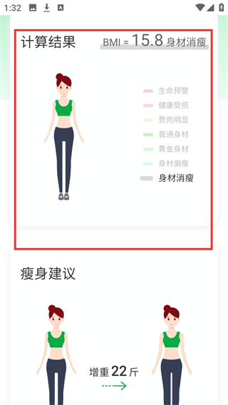 4、填写完成后点击【计算】按钮,即可查看BMI数值及对应的身材评估结果。