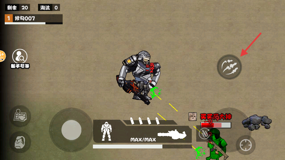 2、对战中右侧的技能图标可释放远程攻击,遇到【买买买大神】这类敌人时要优先瞄准其弱点输出。