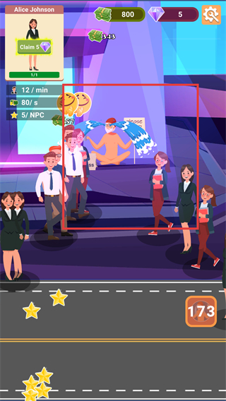 4、聚集已解锁的多个NPC角色在街头区域,能大幅提高每秒收益速度,快速积累金币与钻石资源。
