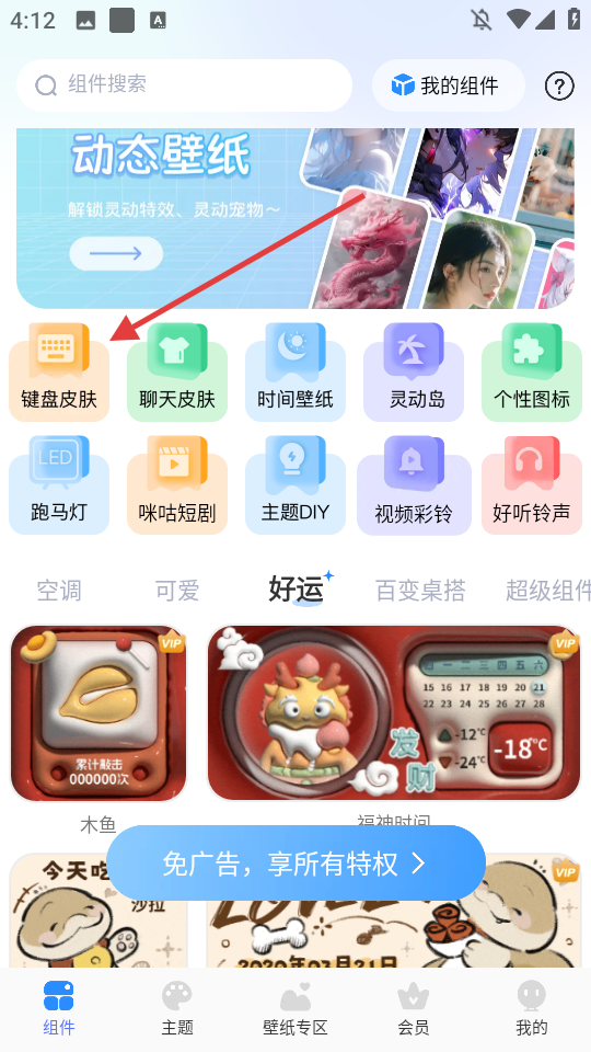 1、在组件界面点击【键盘皮肤】,进入键盘皮肤选择页面。