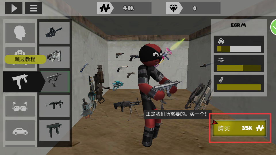 1、资源(【35k】【N】)足够时点击【购买】按钮,获取强力武器提升战斗能力应对城市犯罪。