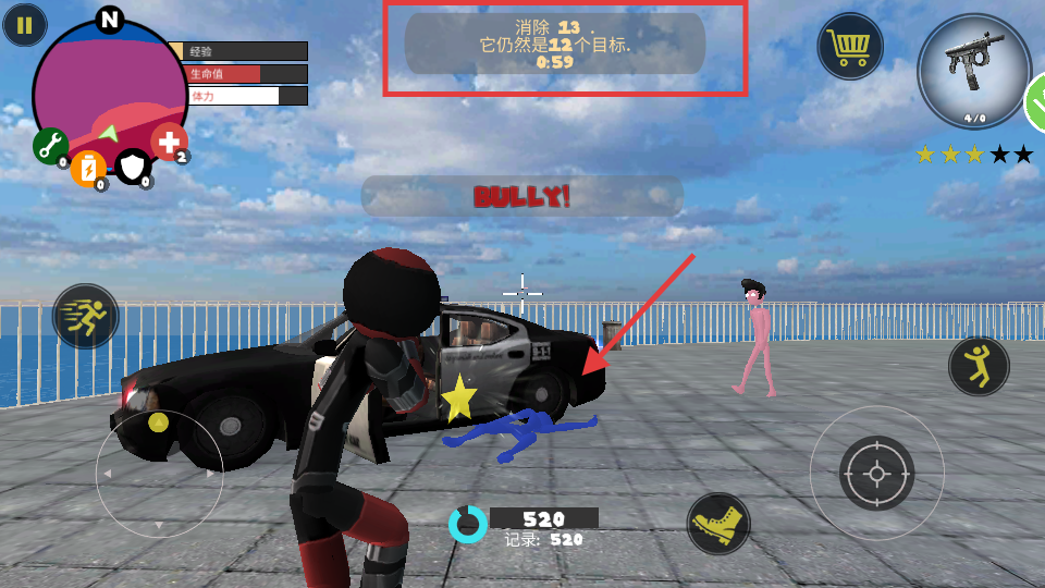 4、关注顶部任务提示(消除【13】,剩余【12】目标),及时消灭敌人,积累【520】记录获奖励。