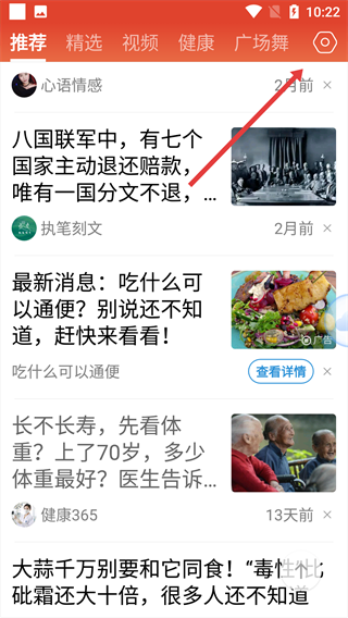 1、打开今日快闻,来到软件的首页中,提供了大量的短视频新闻资讯,点击一下即可播放,点击右上角的齿轮图标。