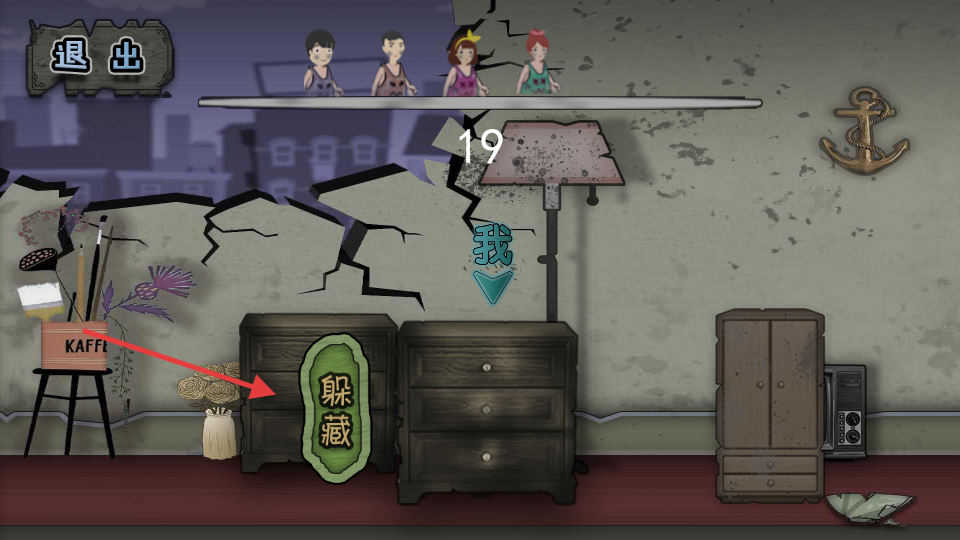 2、倒计时期间,找到【躲藏】按钮并点击,迅速寻得合适藏身点,躲避屠夫的追捕。