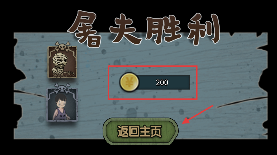 4、屠夫胜利后可获【200】金币,点击【返回主页】,可重新挑战或切换游戏模式。