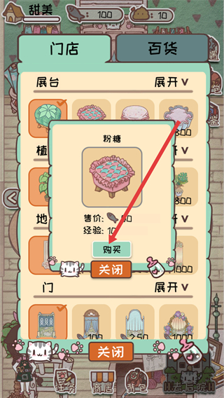 3、查看粉糖展台的售价与经验数值,点击购买按钮。