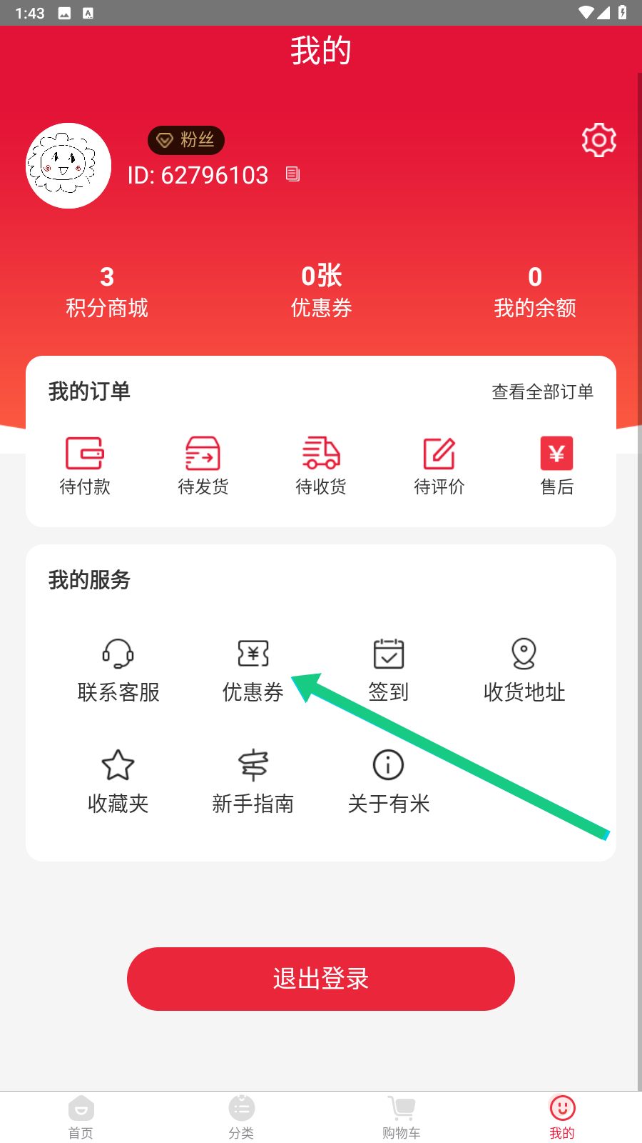 2、在【我的】页面,找到并点击【优惠券】选项,进入相关界面哦。
