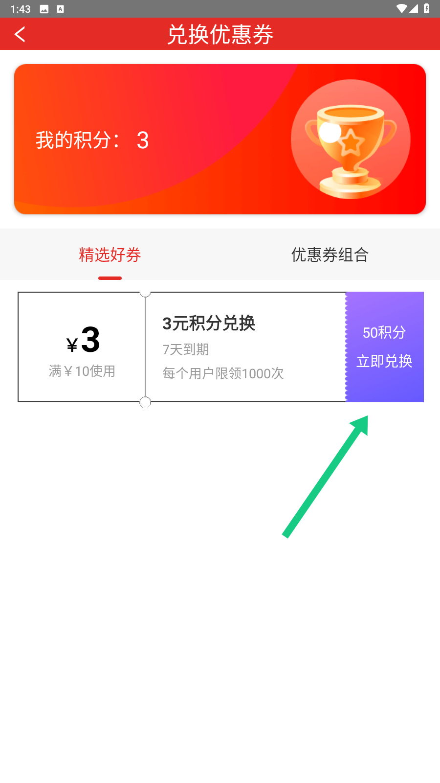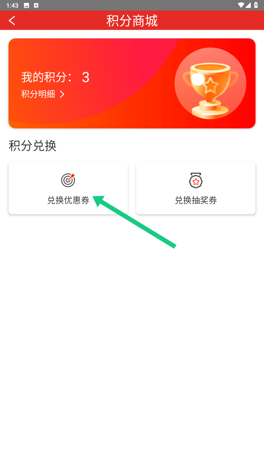 3、进入积分商城后,点击【兑换优惠券】,准备进行优惠券兑换操作呀。