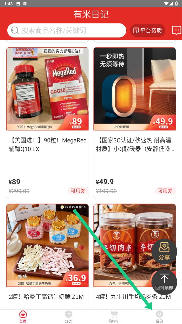 1、打开有米日记App,点击下方【我的】,准备领优惠券呢。