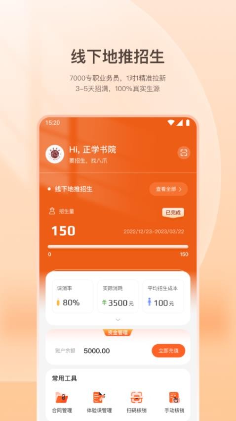 八爪畅学机构端APP是一款为各大教培机构提供运营办公服务的软件,在软件中提供有合同管理、体验课管理、扫码核销、手动核销、营销服务等多种功能可便捷用户在线办公使用,通过营销服务来帮助用户吸引更多客流,促进对课程的销售业绩,其中还提供有课程服务,让用户可以在线将常规课程进行在线登记管理,同时还提供有对老师的管理服务,将课程老师的资料信息进行曝光和转换,让更多客户可以接收到课程的展示信息,其中将教培机构的招生数据进行了统计,让用户能够清楚机构内的招商情况,有需要的用户就快来下载八爪畅学机构端官网版软件进行使用吧!