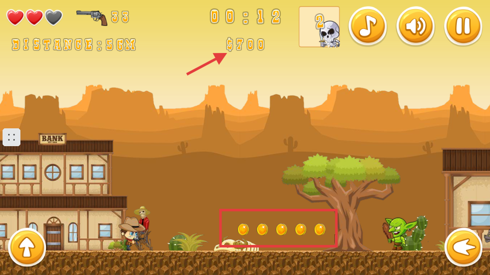 2、关卡中收集地面金币,上方【$】数会增加,积累金钱可用于提升或购买道具。