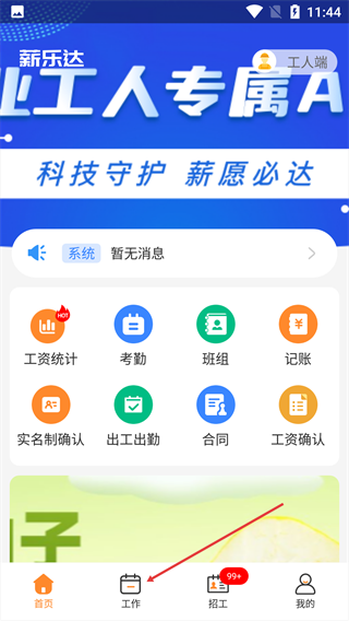 1、点击底部的【工作】按钮,进入工作功能页面。