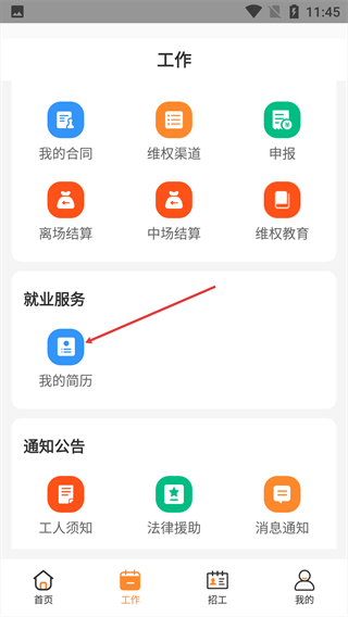 2、在工作页面的“就业服务”板块中,点击【我的简历】选项。