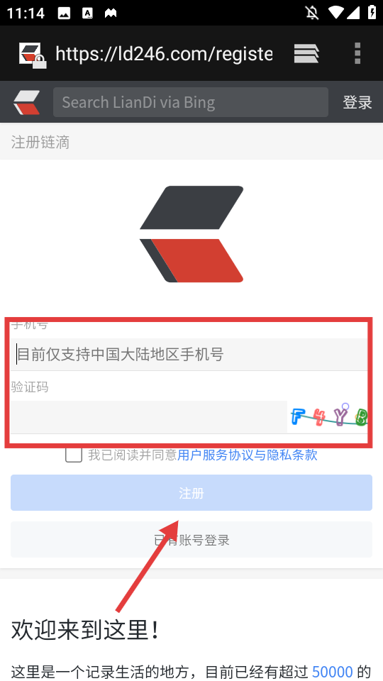 4、在注册页面,输入中国大陆手机号、验证码,勾选协议后点击【注册】完成操作。